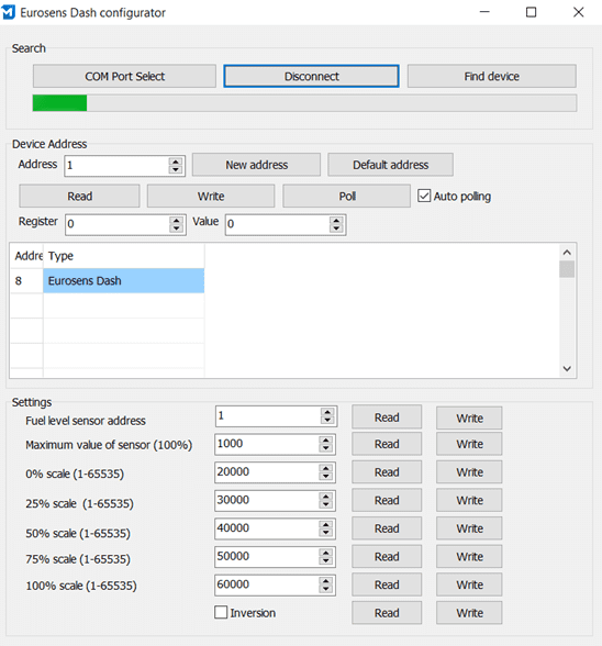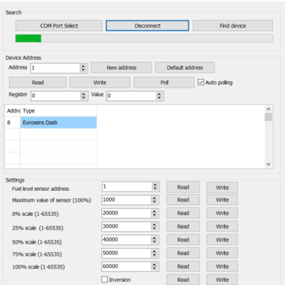 Для настройки подключаем Eurosens Dash к ПК через сервисный адаптер Eurosens Destination (в режиме RS-485)